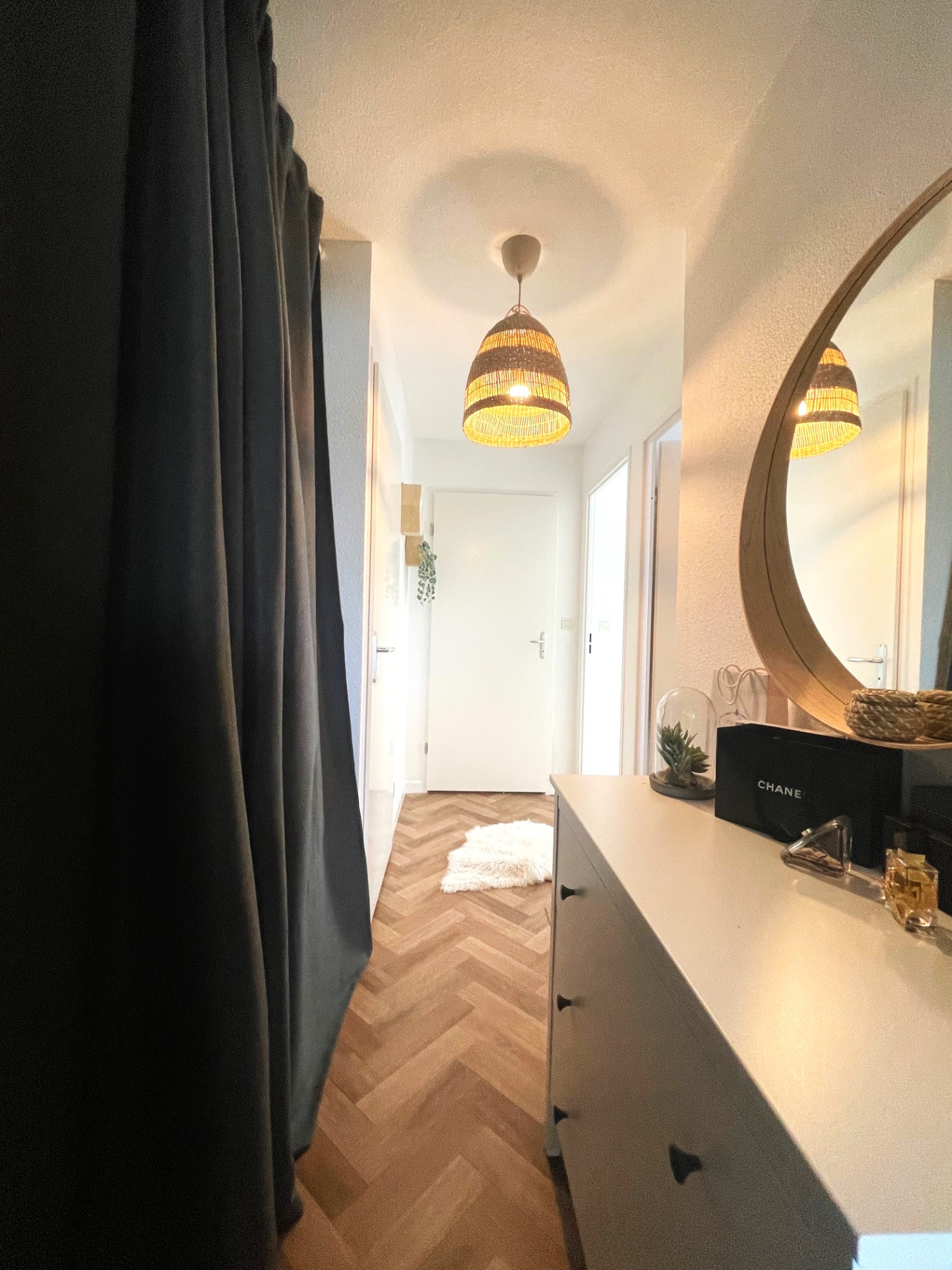 Un couloir avec rangements dessert deux belles chambres avec dressing, une salle de bains et d’un WC séparé.