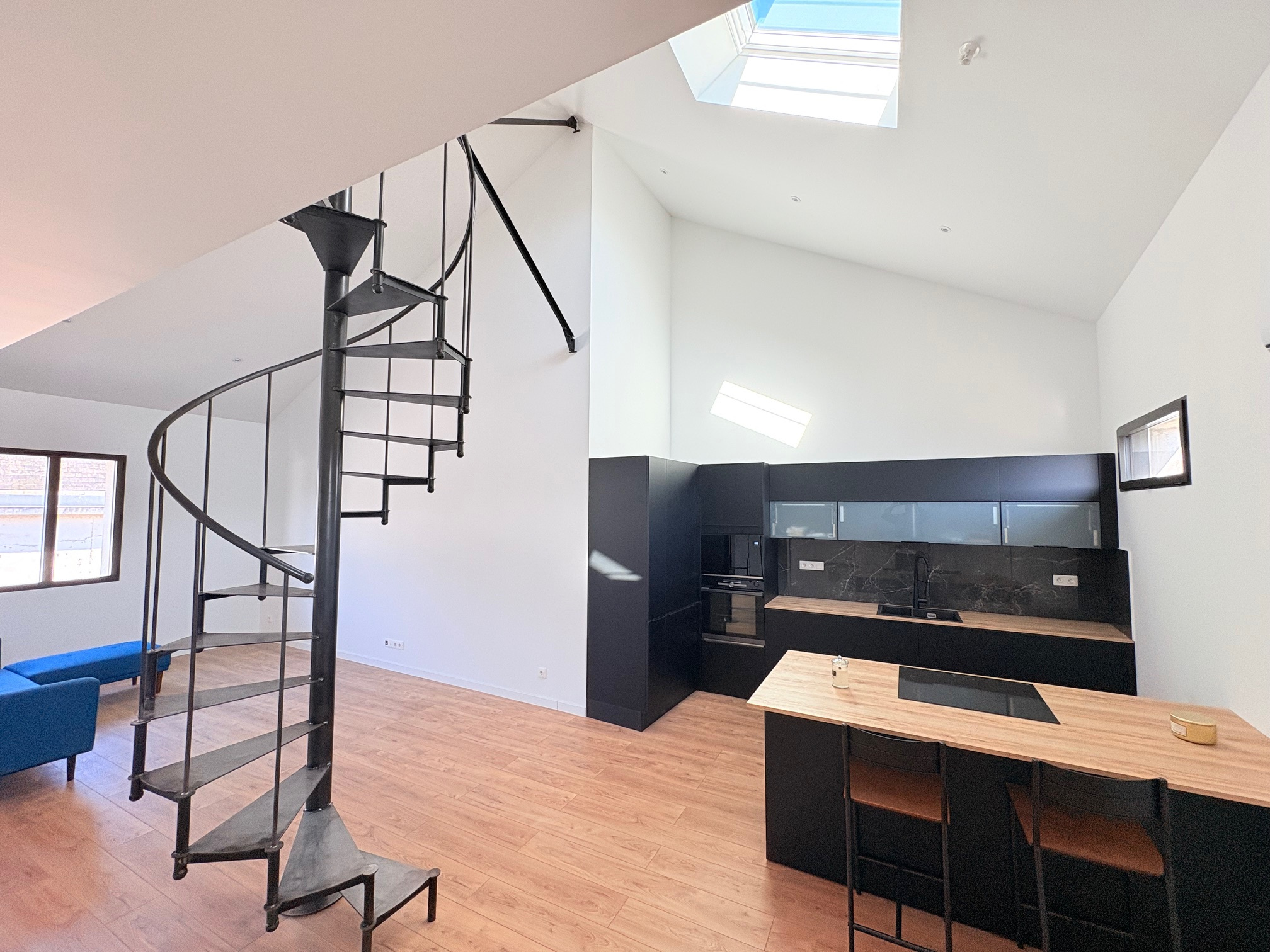 Une belle mezzanine lumineuse, idéale pour un bureau, coin lecture ou espace détente