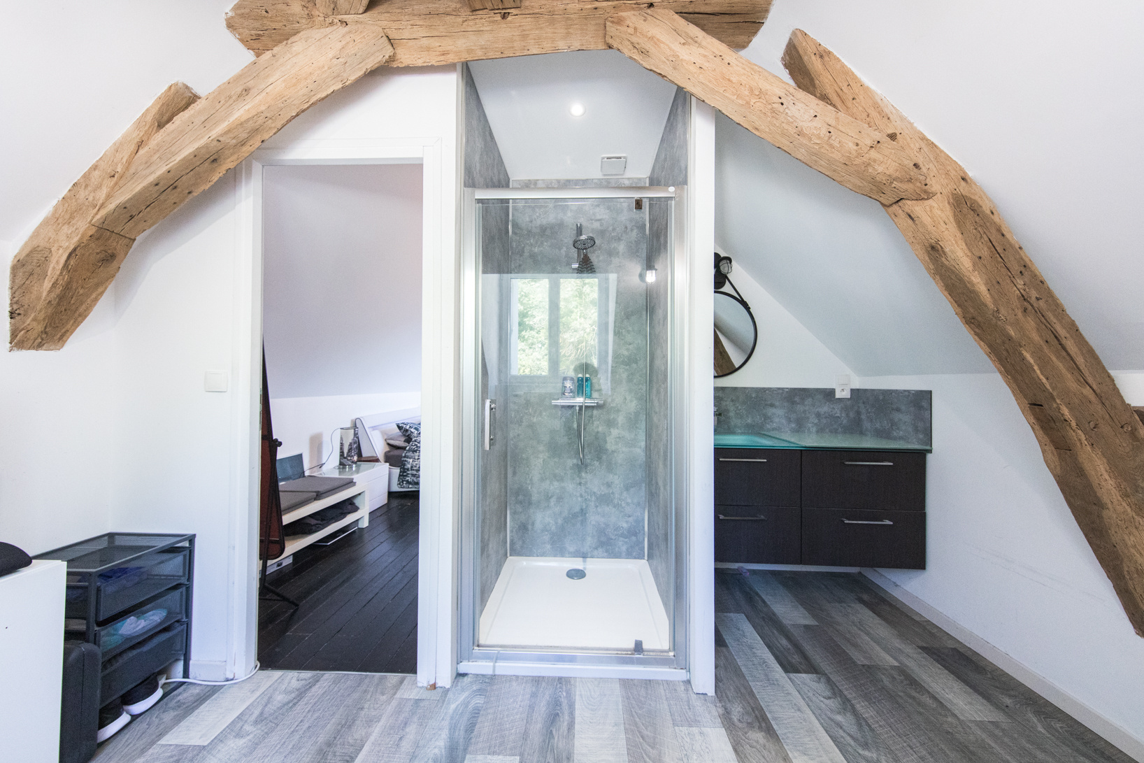 A l’étage, une chambre accueillante avec salle d’eau privative vous attend.