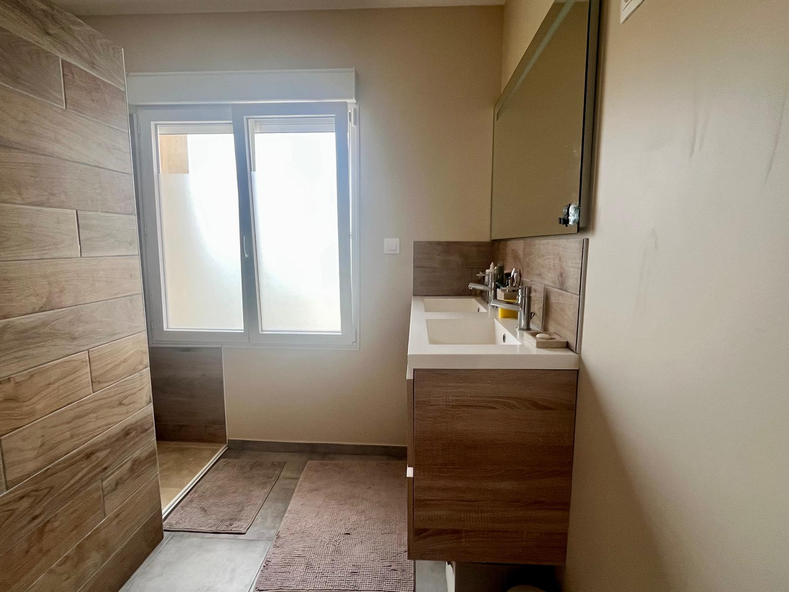 L’étage est composé de deux chambres, d’une salle d’eau moderne avec double vasque et douche à l’italienne et des wc.