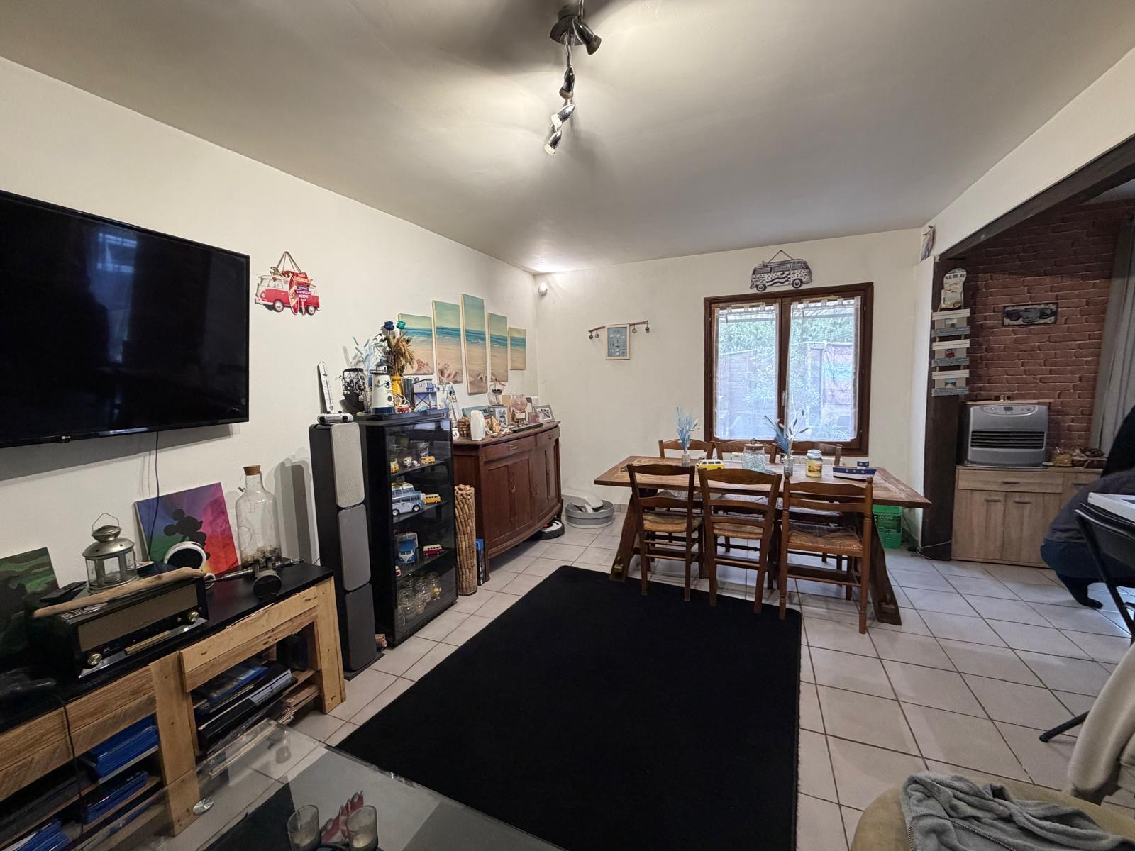Au rez-de-chaussée : entrée sur une spacieuse et lumineuse pièce de vie avec cuisine aménagée et équipée (plaque induction, hotte, four, lave-vaisselle), ainsi qu’une salle d’eau avec WC. À l’étage, vous trouverez deux chambres et une seconde salle d’eau avec WC.