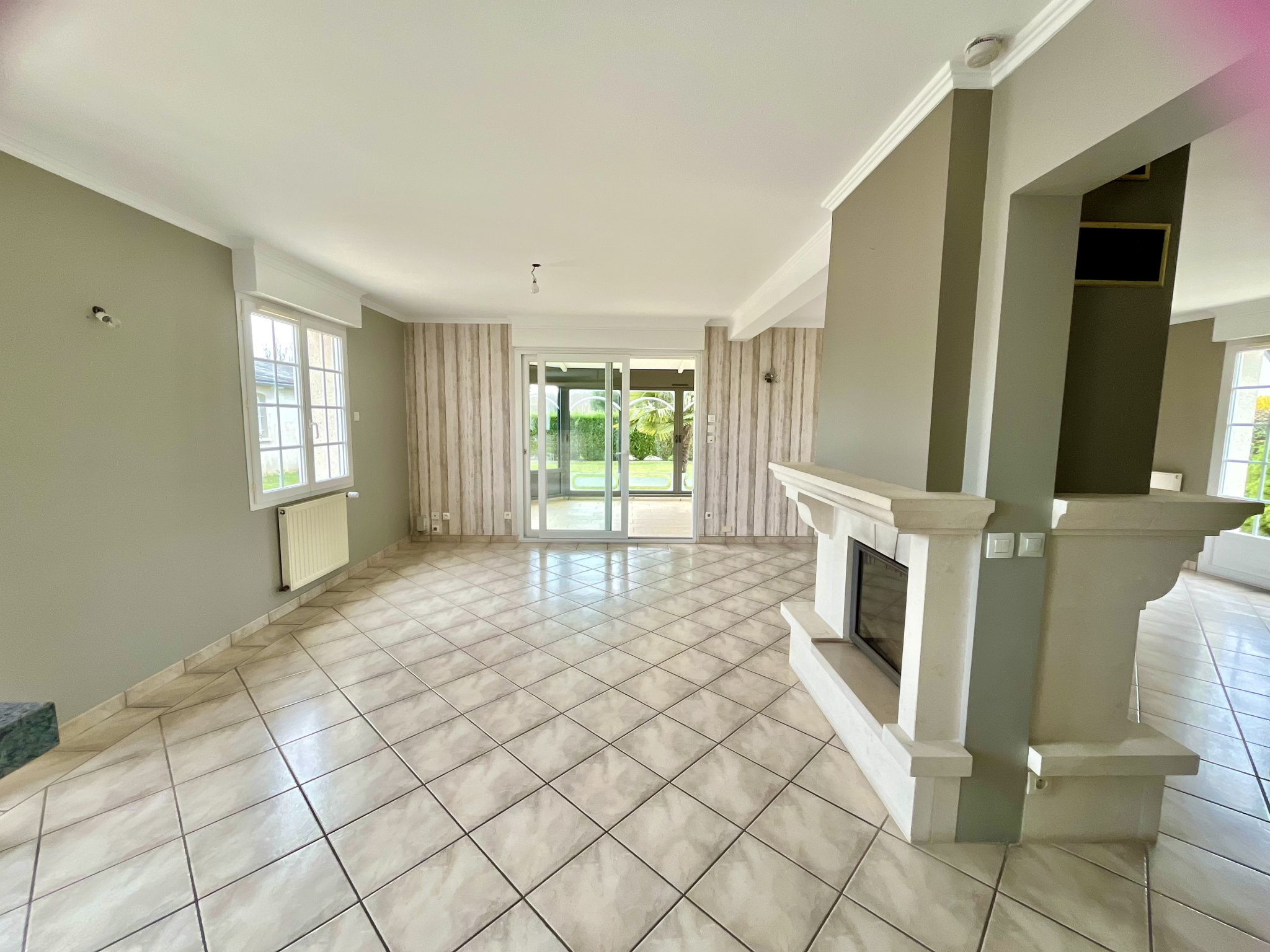 Le rez-de-chaussée continue ensuite sur une vaste pièce de vie de plus de 55 m2 avec une cheminée centrale, une cuisine aménagée et une belle véranda d’environ 20m2, le tout baigné de lumière et ouvert sur le jardin et les terrasses.